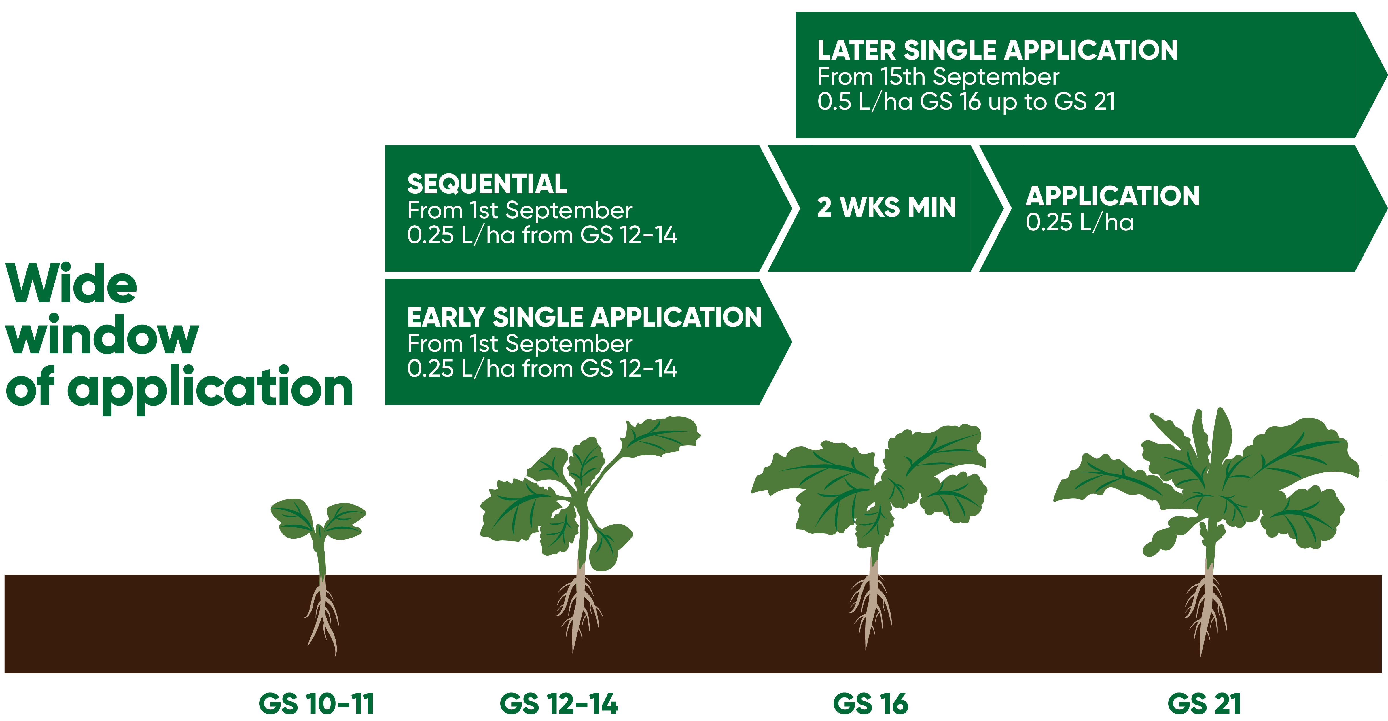 Belkar® can be applied at 0.5L/ha from 15th September once 90% of the crop has 6 true leaves (GS16) or at 0.25L/ha if the crop is smaller than this. Growers must remember that the application rate should be governed by the growth stage of 90% of the crop.